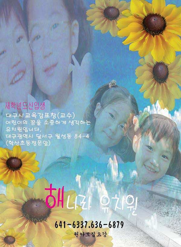 앞서 리플에서 컨셉부터 생각한다면, 유치원이니까 '아이들', '유치원전경'이 주요한 부분이겠지요. 위의 이미지요소에서 중요한 것은 아이들에 맞추면 저렇게 투명도를 줘서 뭉게버리면 안되겠죠^^;